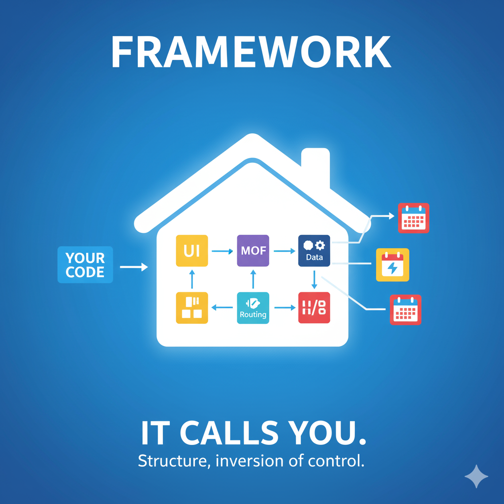 در حقیقت فریم ورک همانطور که از نام آن پیدا است یک چهارچوب کلی برای کدنویسی است.فرض کنید که در یک کشور مجلس آن کشور یک سری قوانین را تعیین میکند و شهروندان می بایست مطابق آن عمل کنند و نمیتوانند از این چهارچوب خارج شوند.فریم ورک هم دقیقا همین گونه است.یعنی تعیین میکند که برنامه نویس طبق شرایط و ضوابطی که وجود دارد برنامه نویسی انجام دهد.